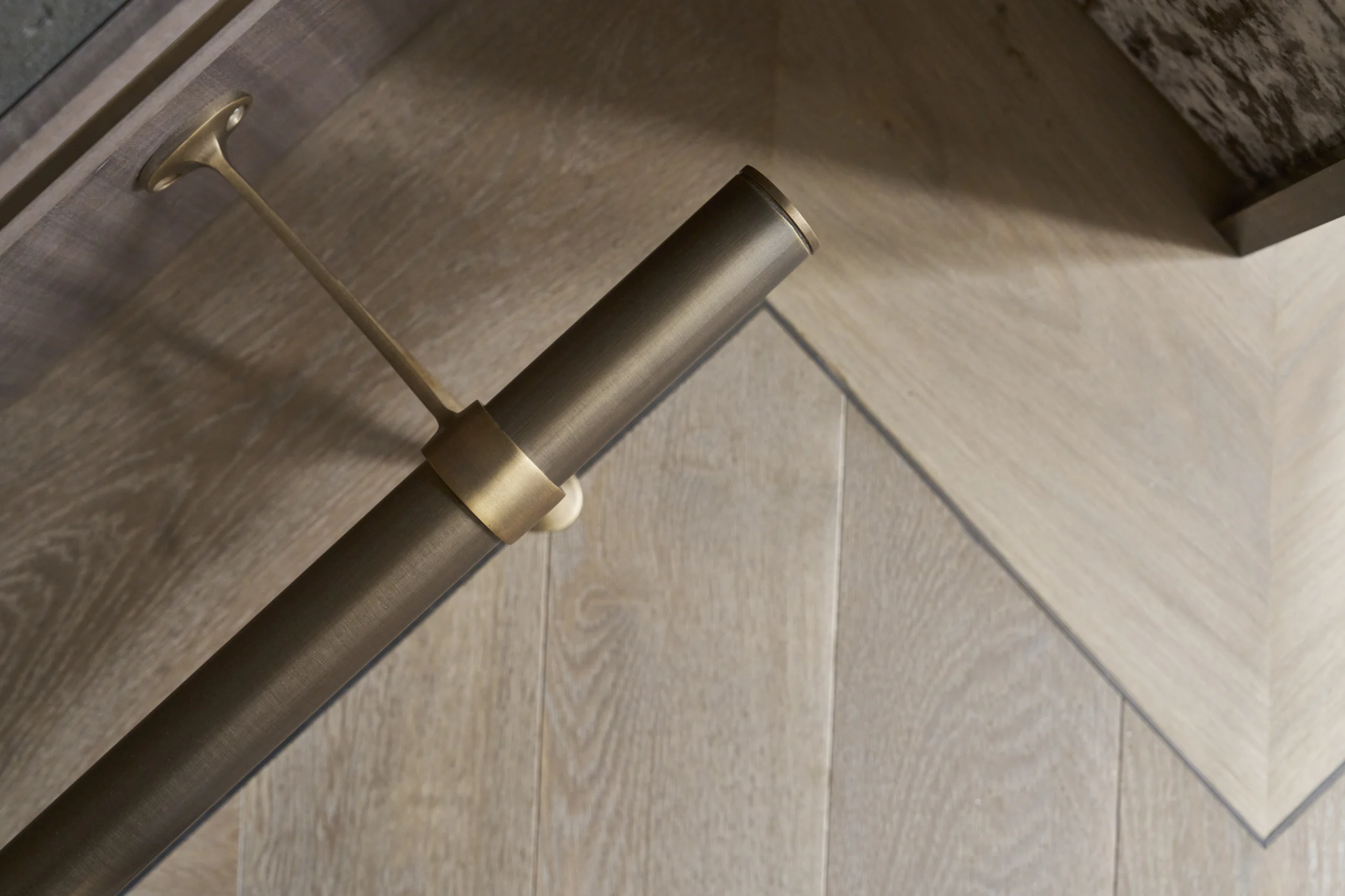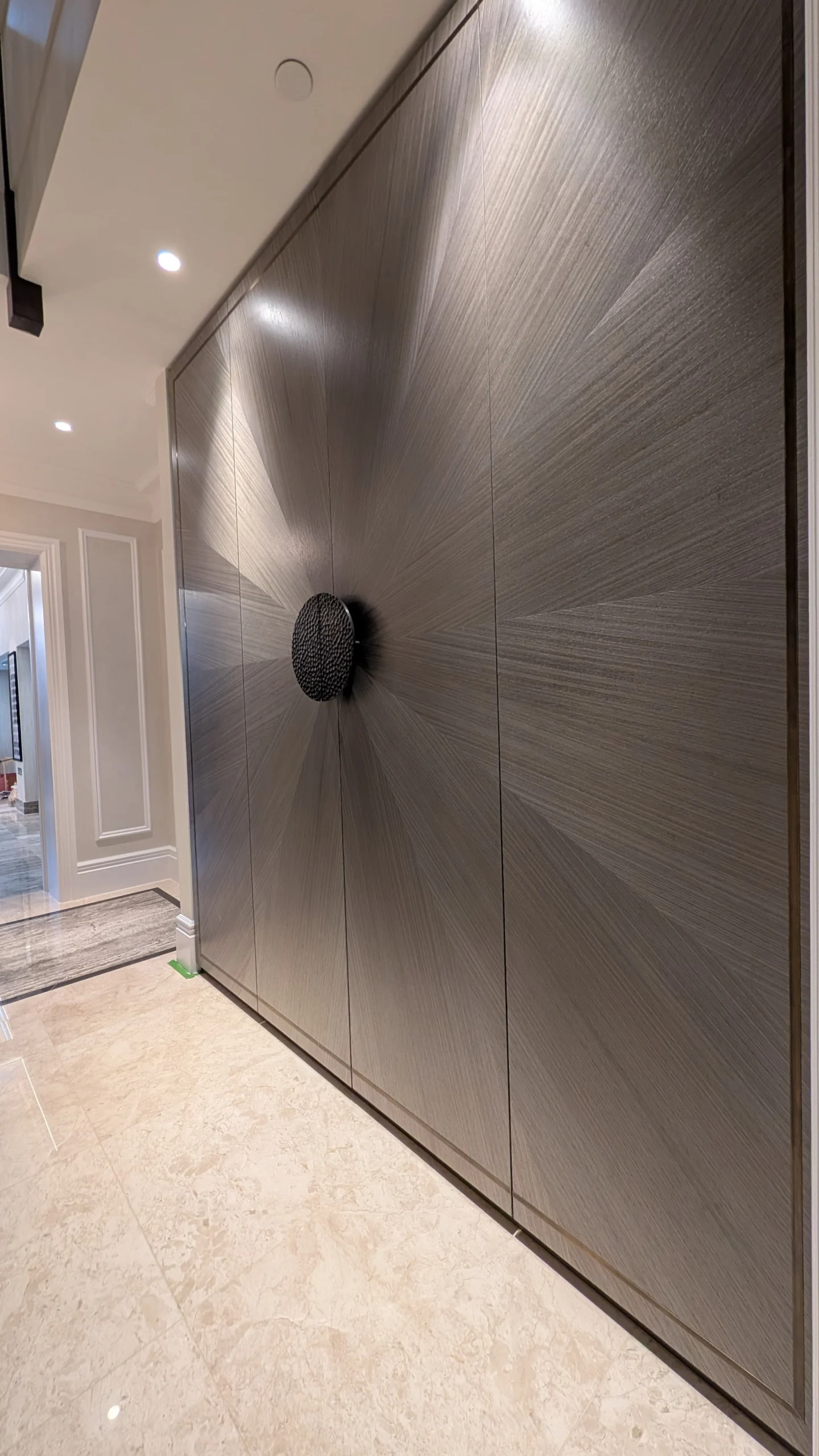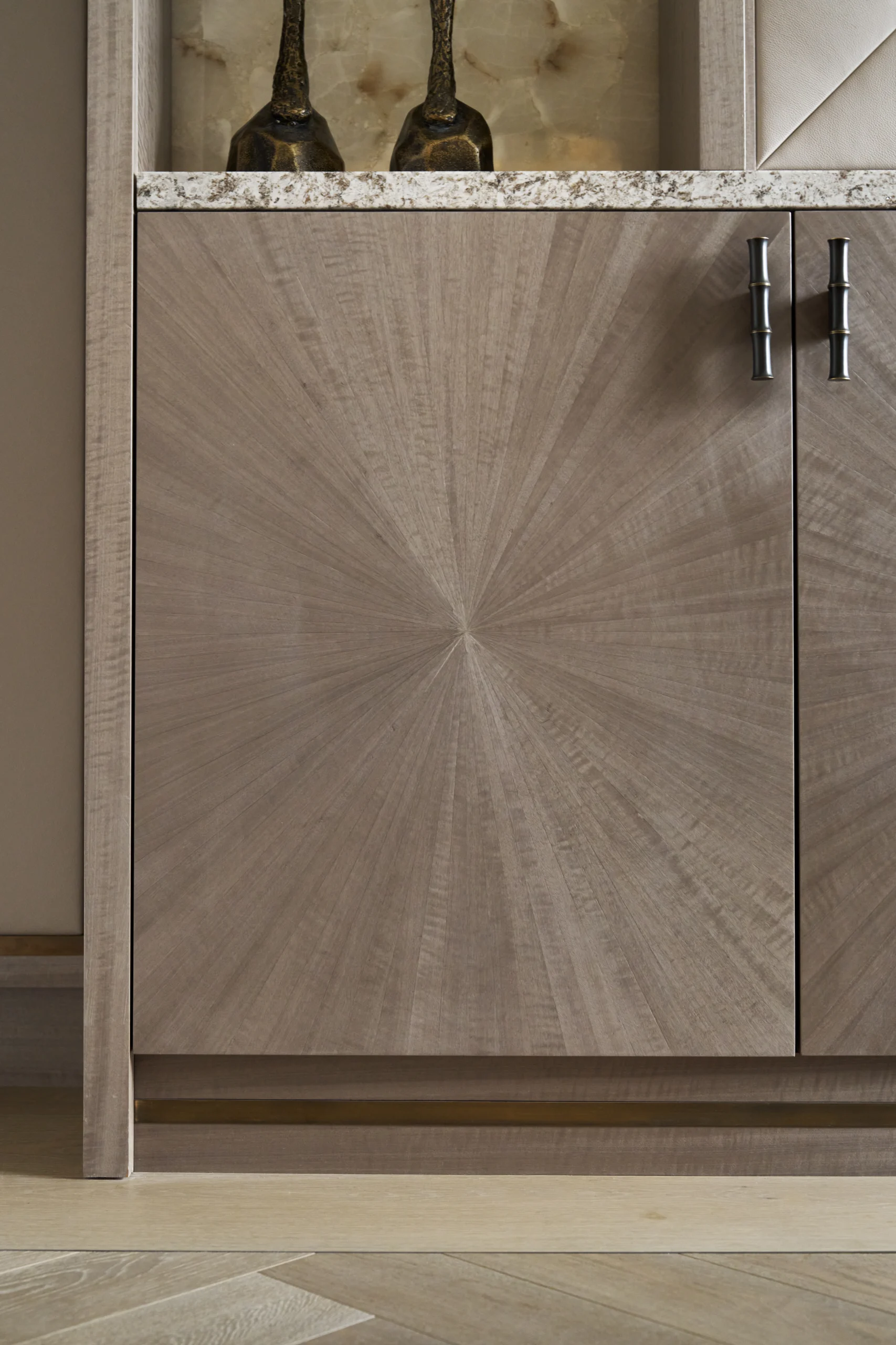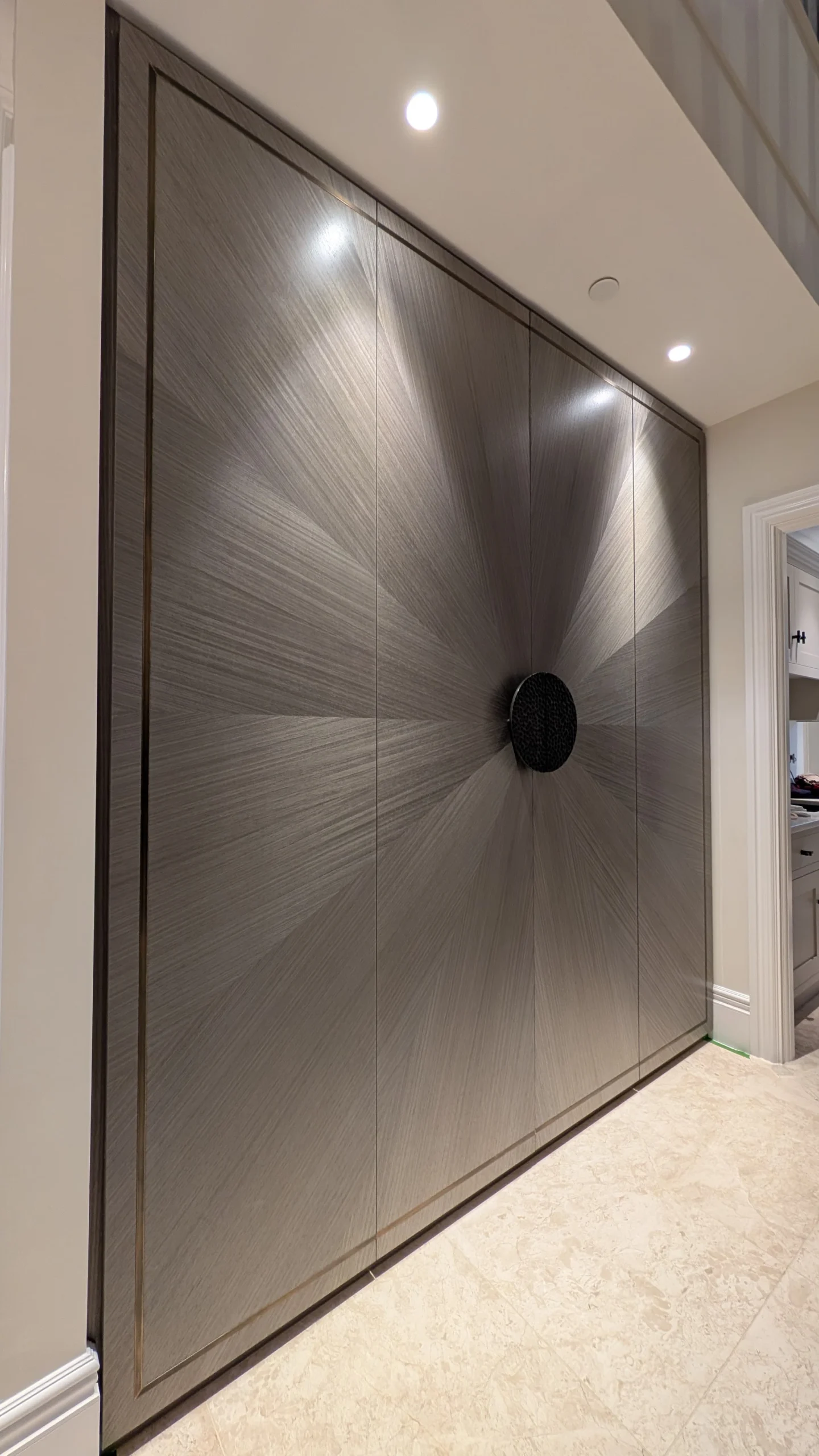 Created for a returning client in Bishop’s Stortford, these bespoke pieces were designed to bring elegance, character and craftsmanship into the heart of the home. The hallway wardrobe makes a striking statement with its sunburst design in a grey exotic veneer, complemented by solid brass handles and delicate brass inlay.