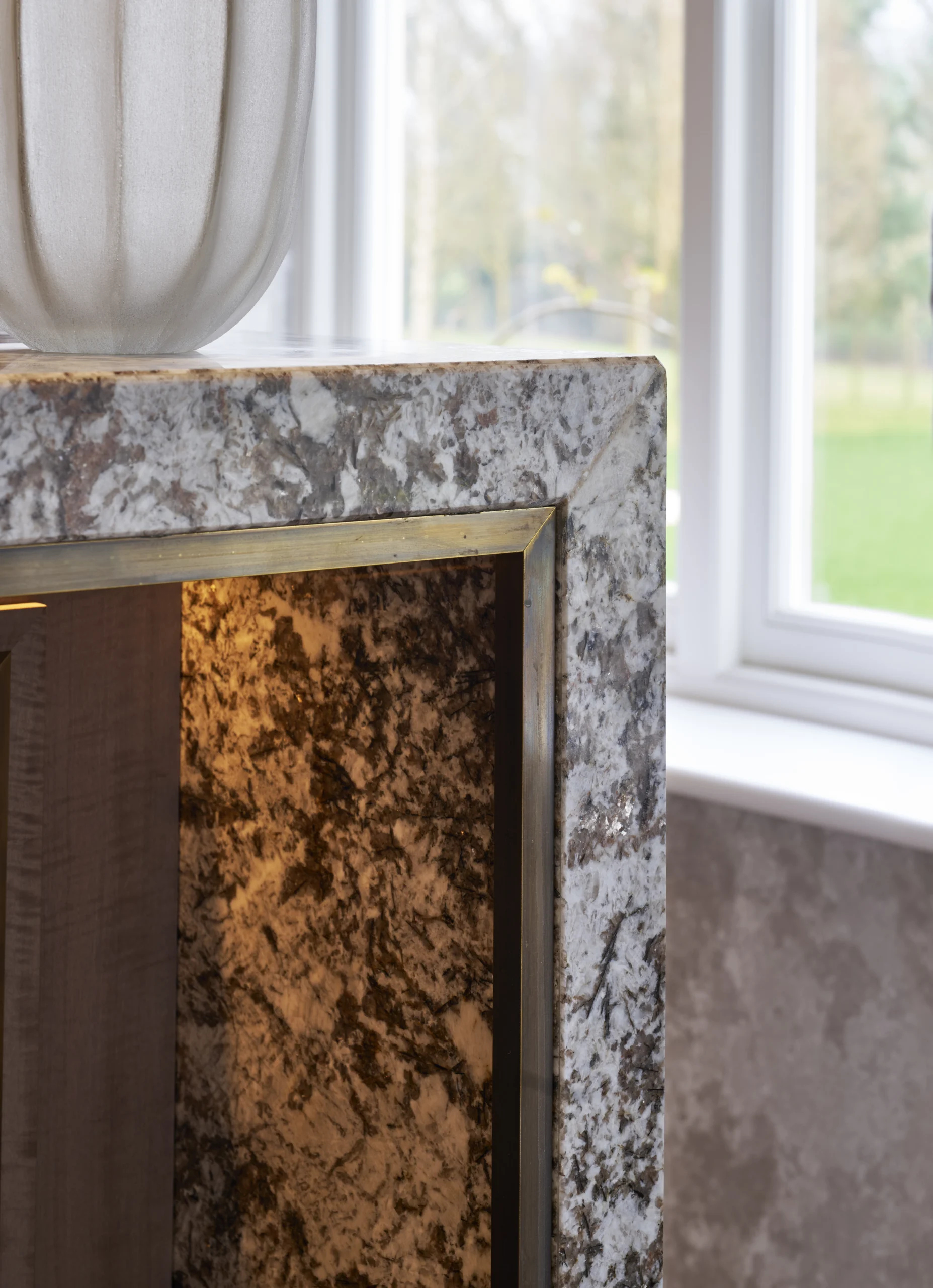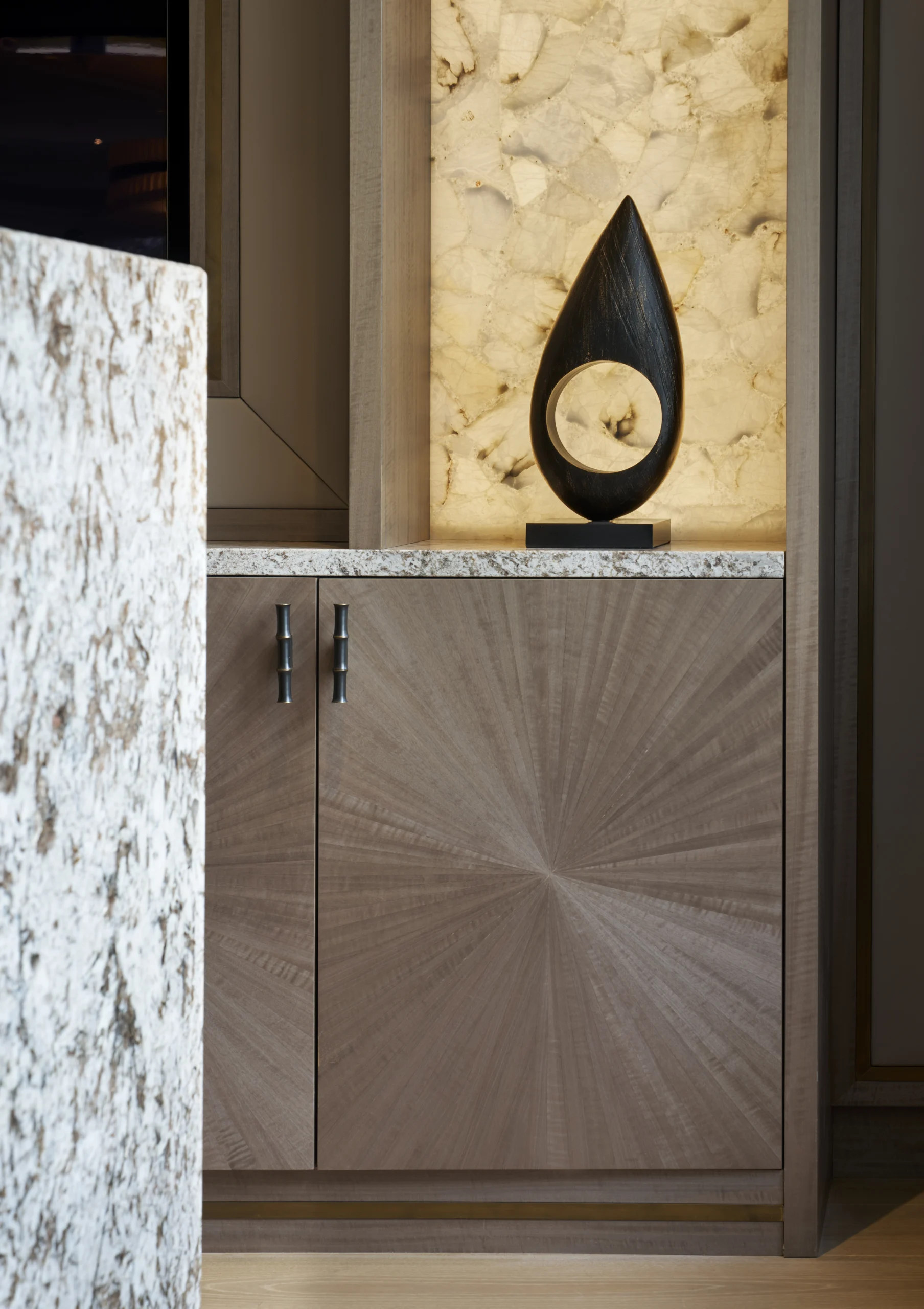 Alongside this, we also created a stunning bar and TV unit using a rich palette of truly unique materials, including figured veneer, brass, leather, stone, onyx and Liquid Metal. The outstanding sunburst doors add depth, texture and a luxurious finish, giving the entire installation a refined and sophisticated presence. Together, these pieces showcase a seamless blend of exceptional materials, detailed craftsmanship and timeless design.
