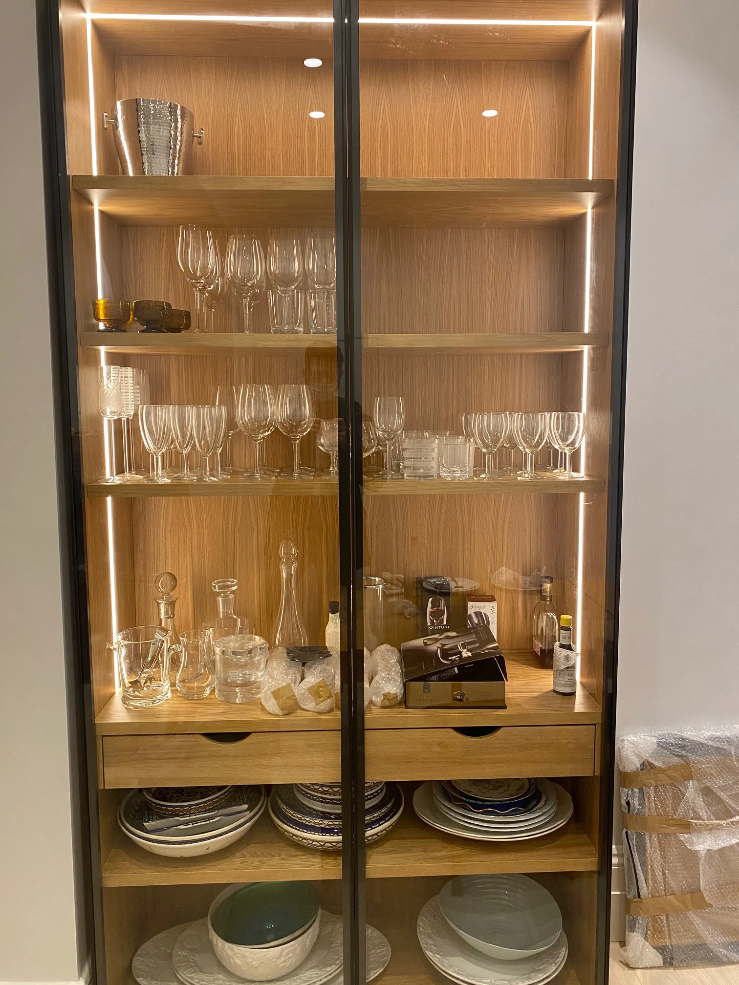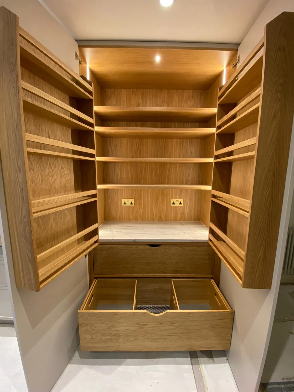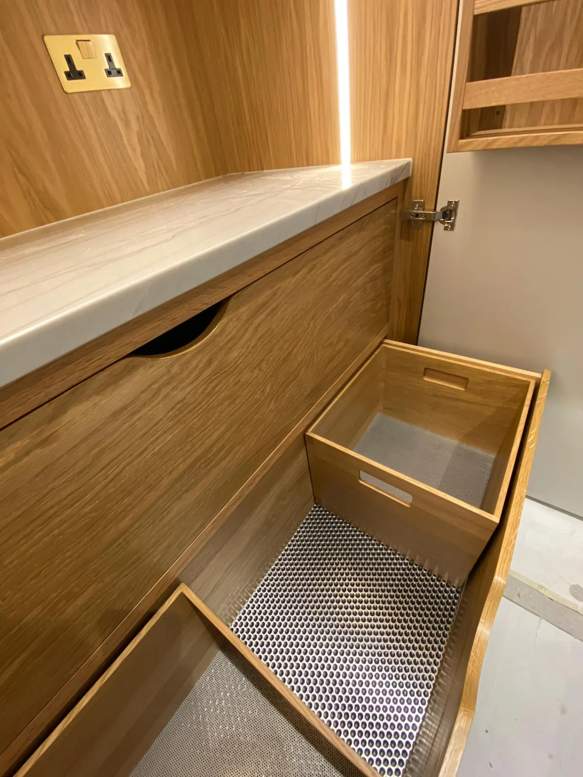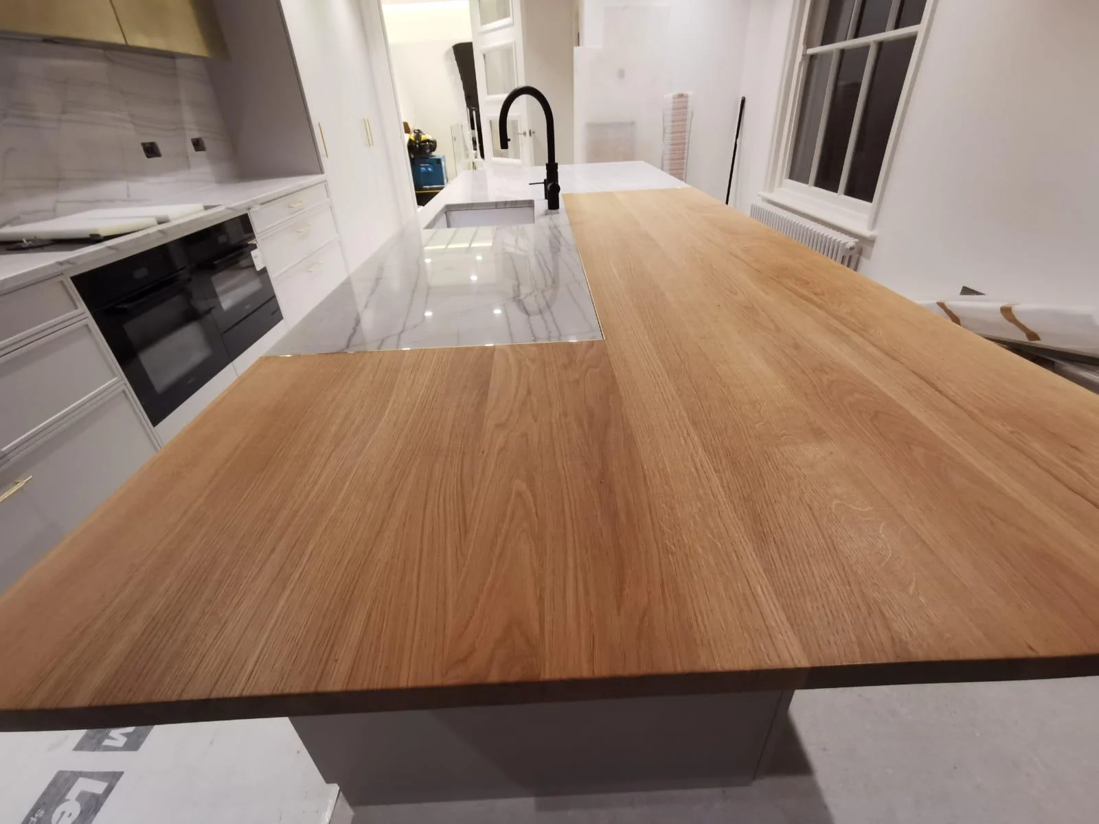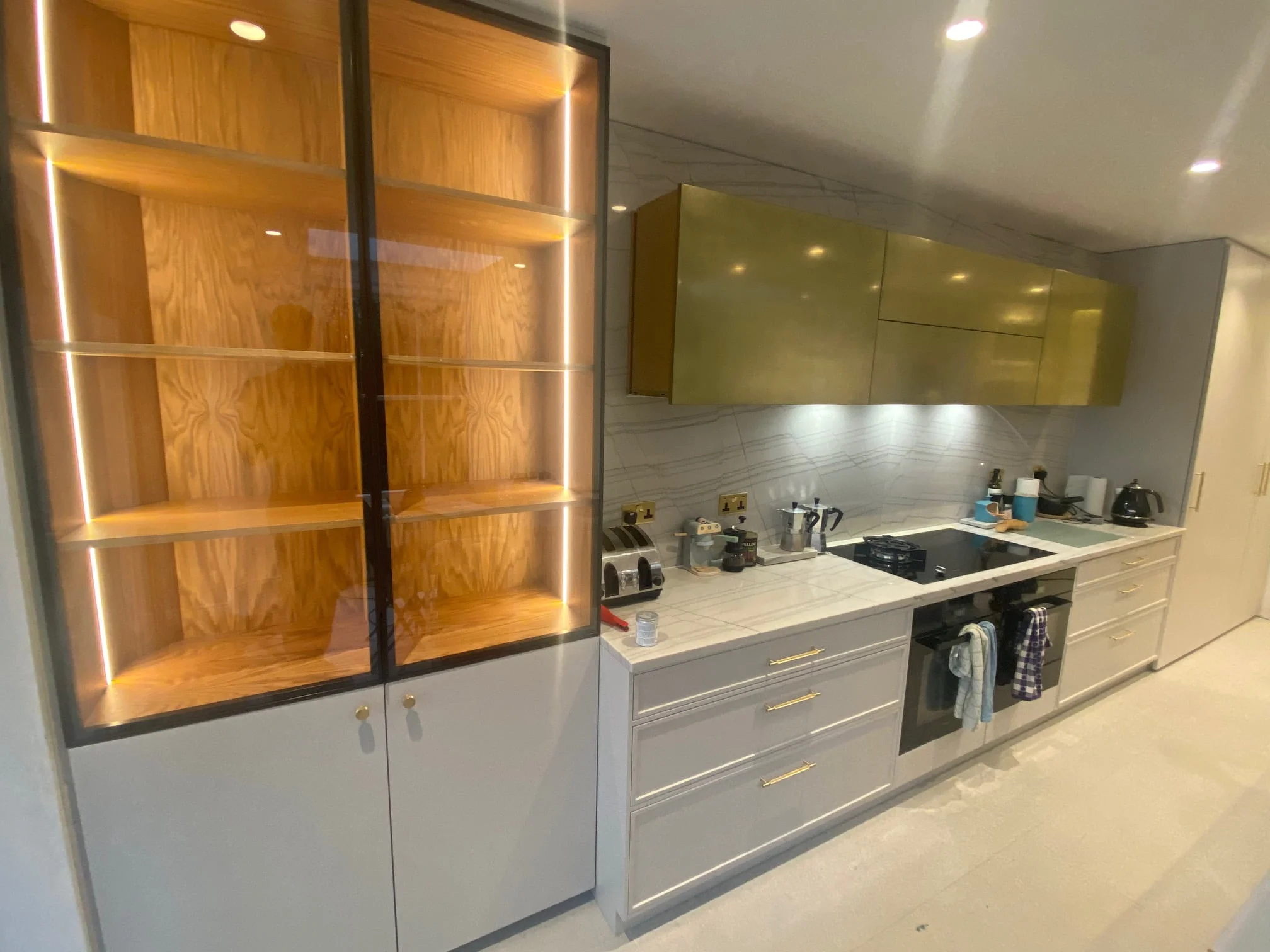This modern kitchen was made for one of our most recent clients in London, Kensington. What makes it different is the combination between interesting materials and finishes that are used throughout this space – like thin shaker door fronts covered with Farrow & Ball grey paint or solid wood veneer cabinets paired nicely against highly polished concrete counters which have been customized to match exactly what they needed inside their home! The end result? A sophisticated yet stylish cooking area where even more than just food will be cooked up each day