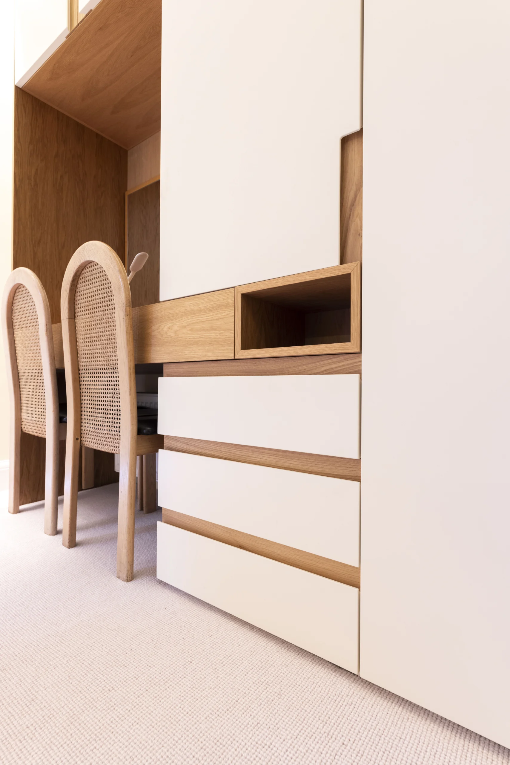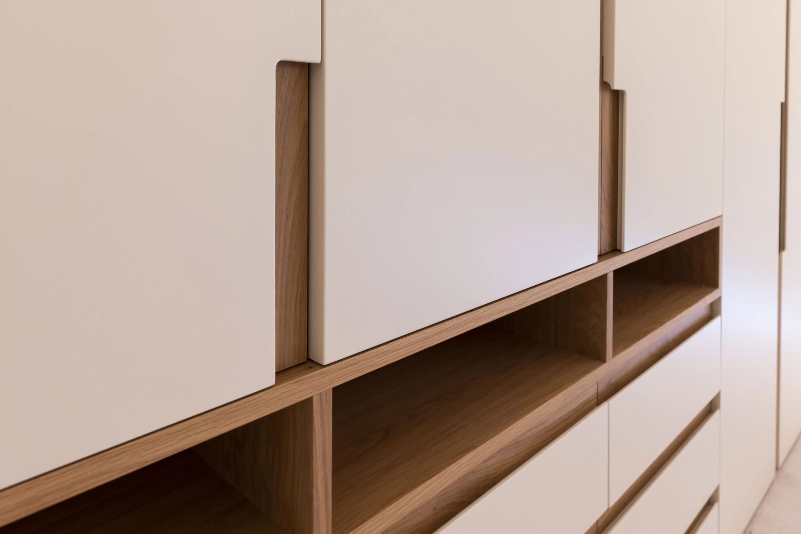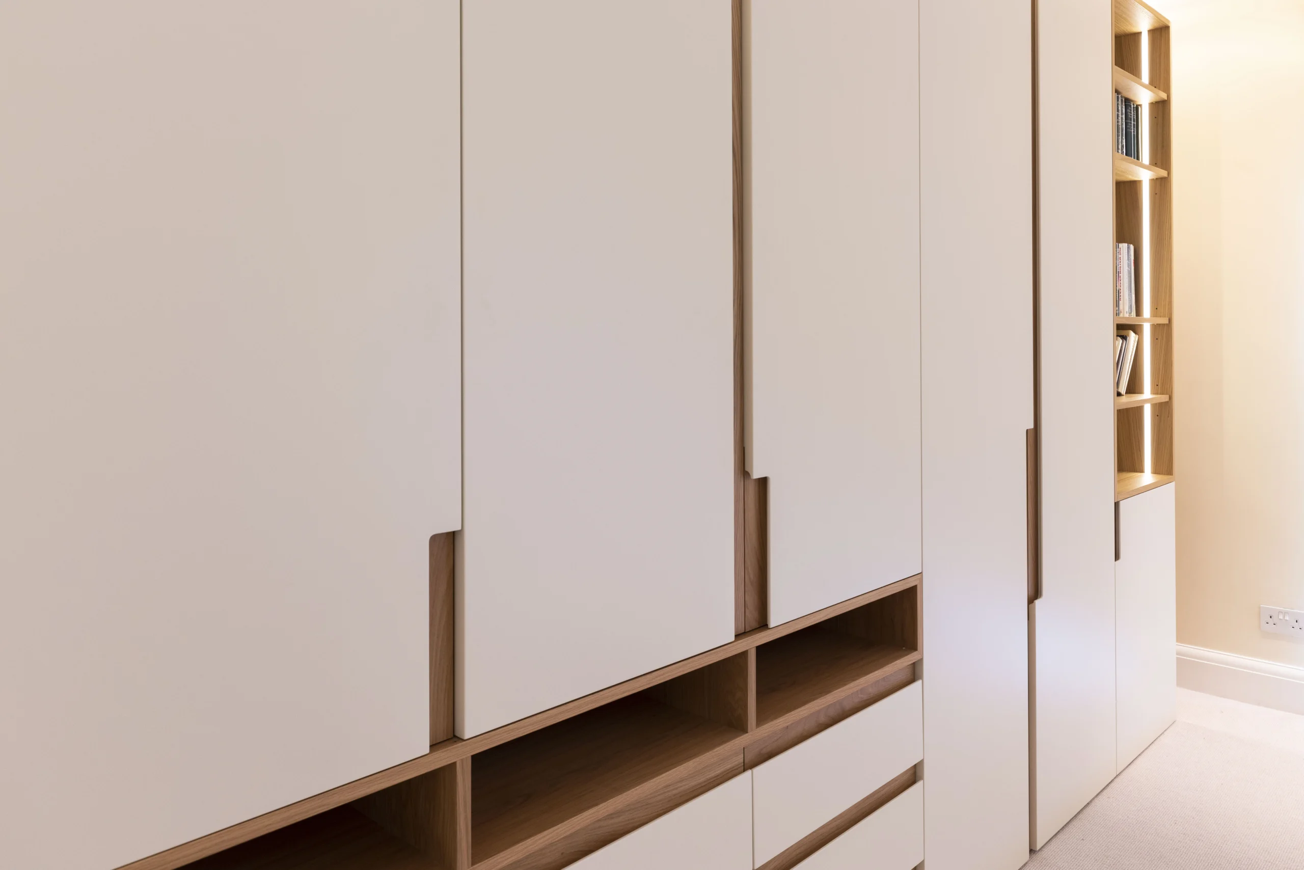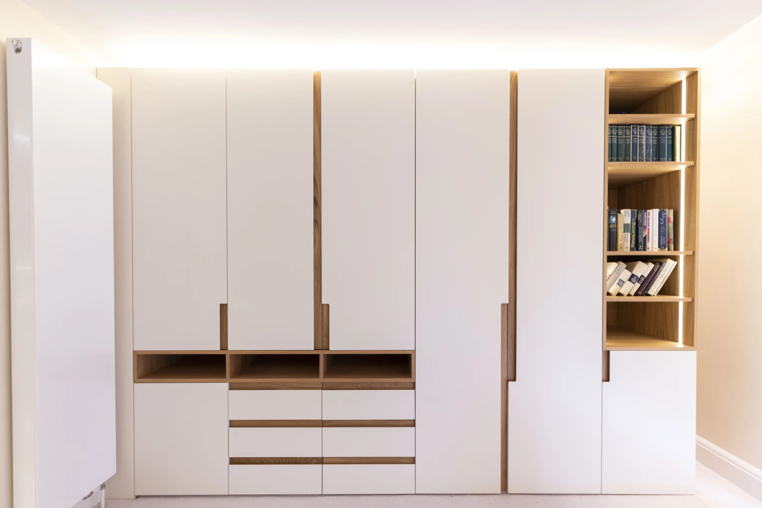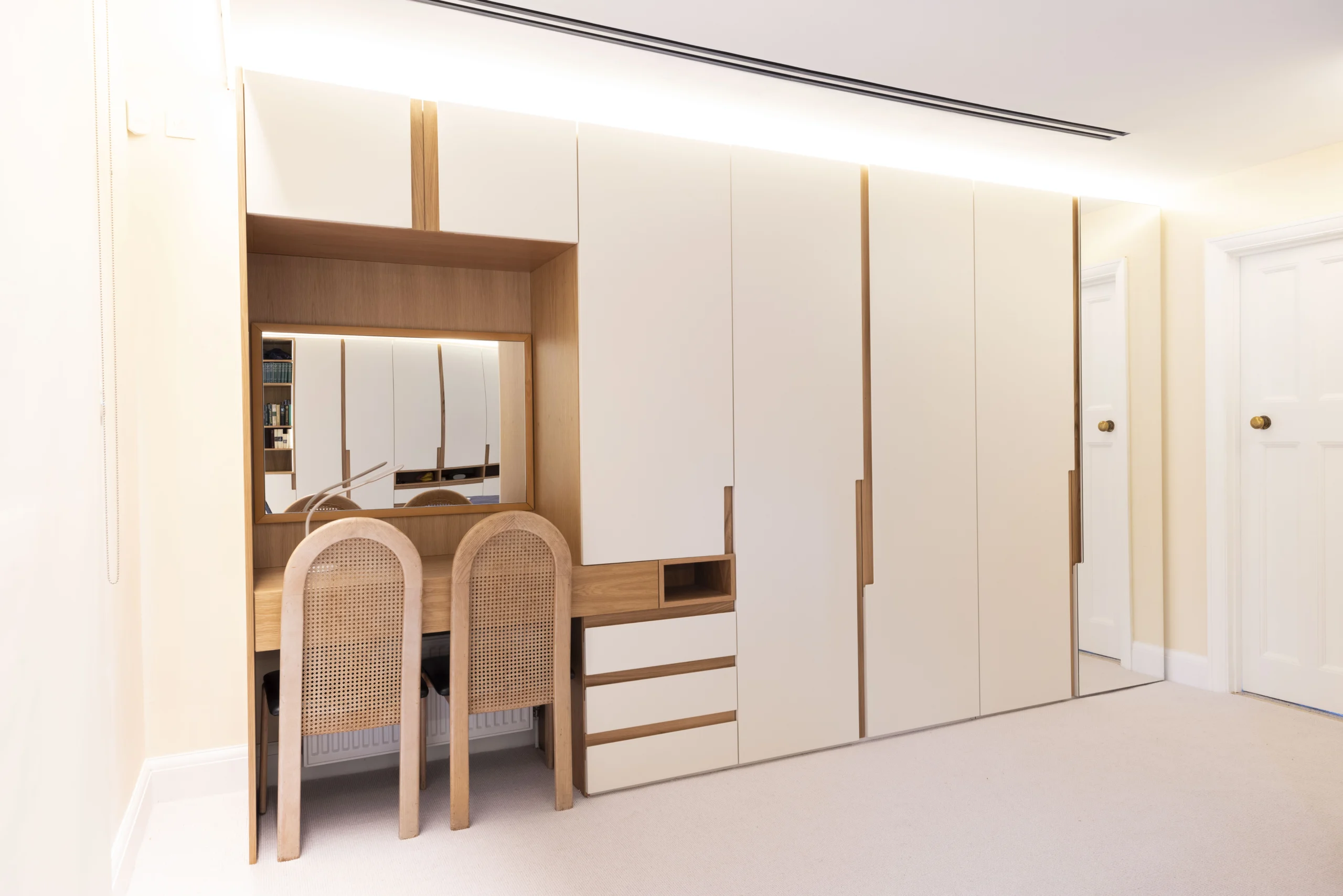 The first floor wardrobes are made of real wood veneer carcass, bespoke oak handles and integrated led lights with sensors.