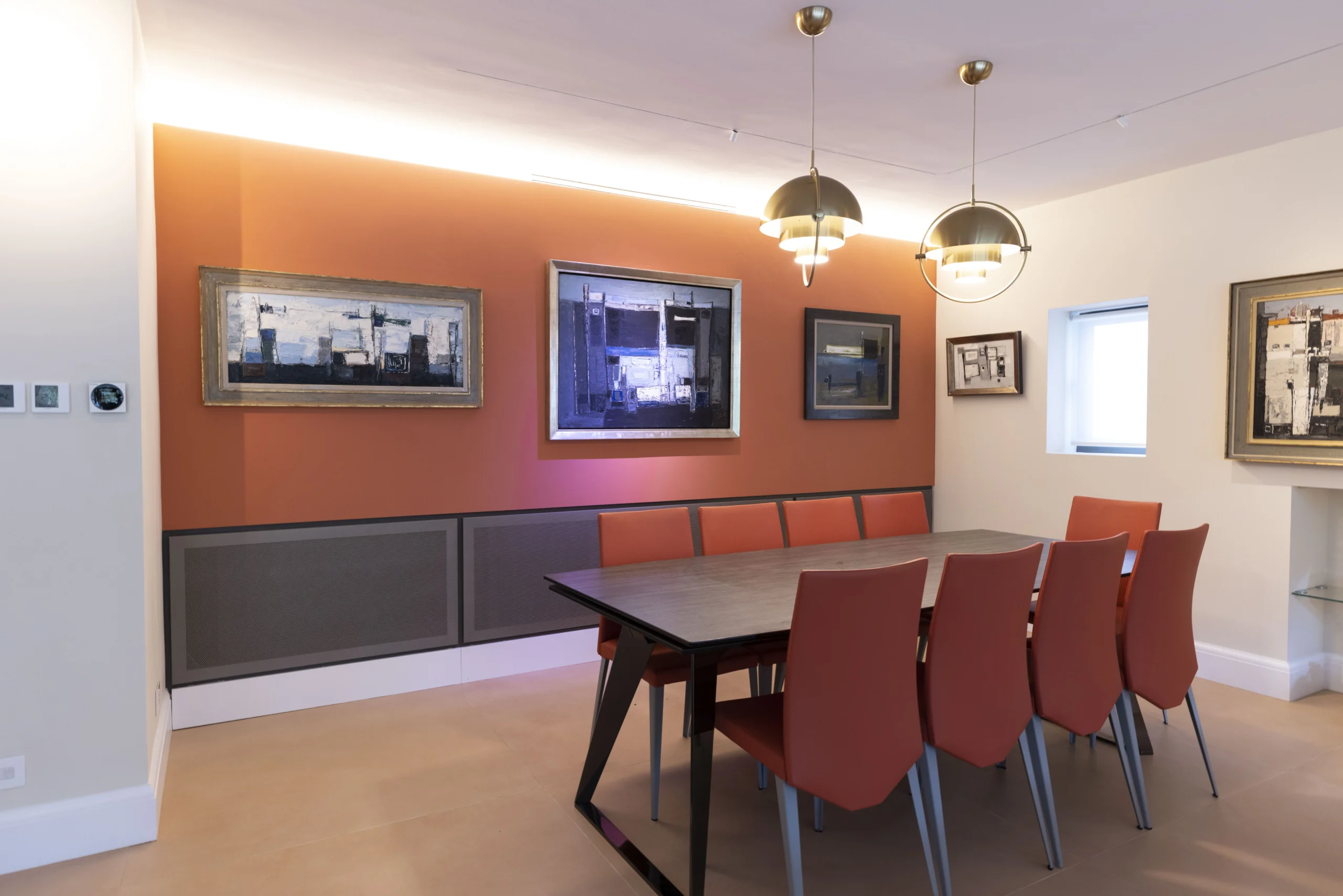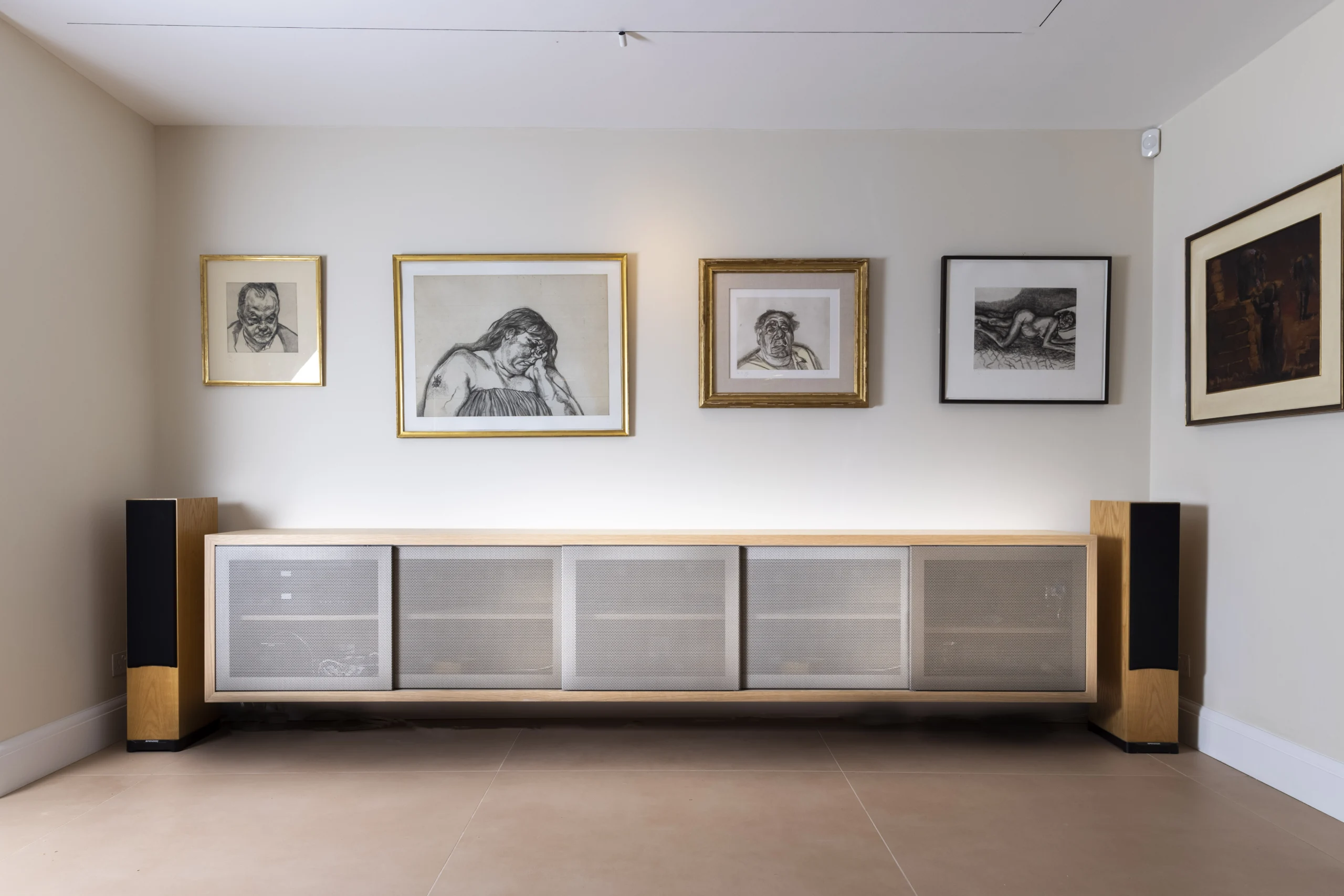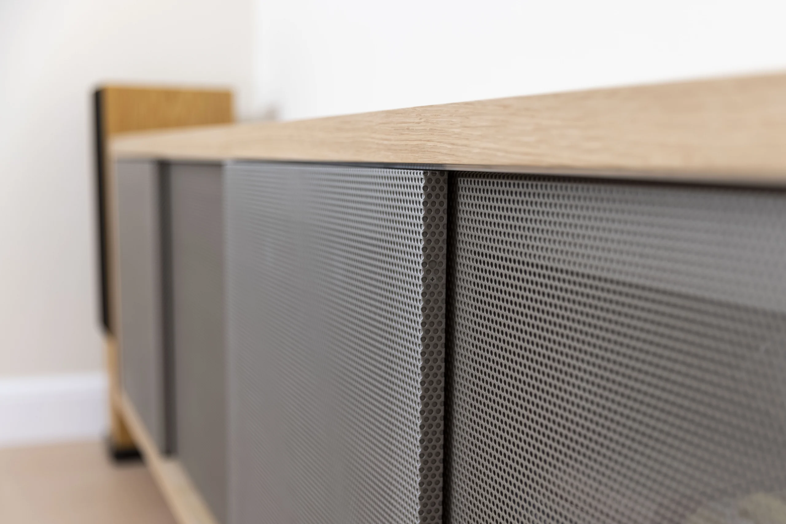 For the Living room joinery we have used awesome perforated sheets that then were turned into sliding doors and sprayed to metallic paint. The media unit is completely floating and was built in order to hide away some AV equipment and provide its ventilation at the same time.