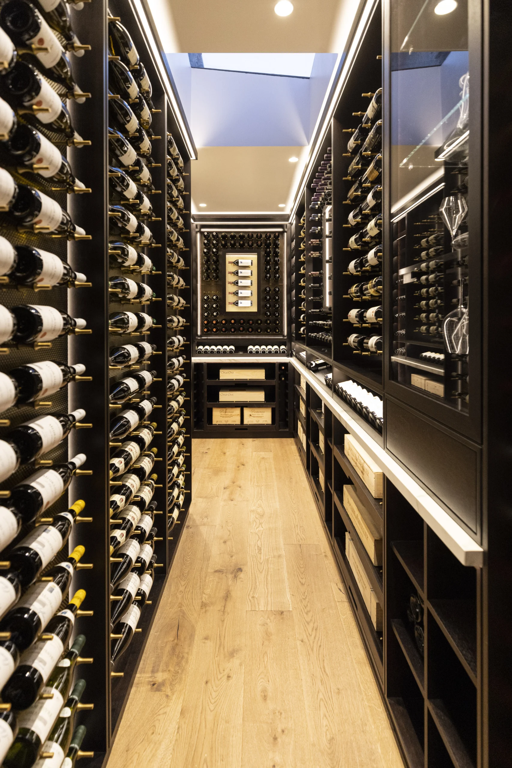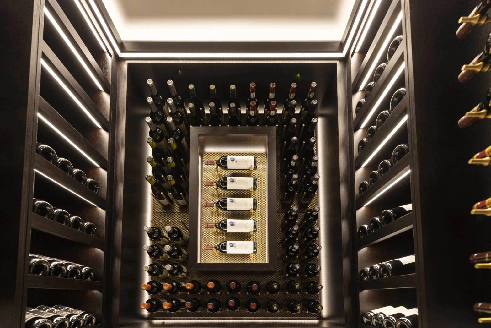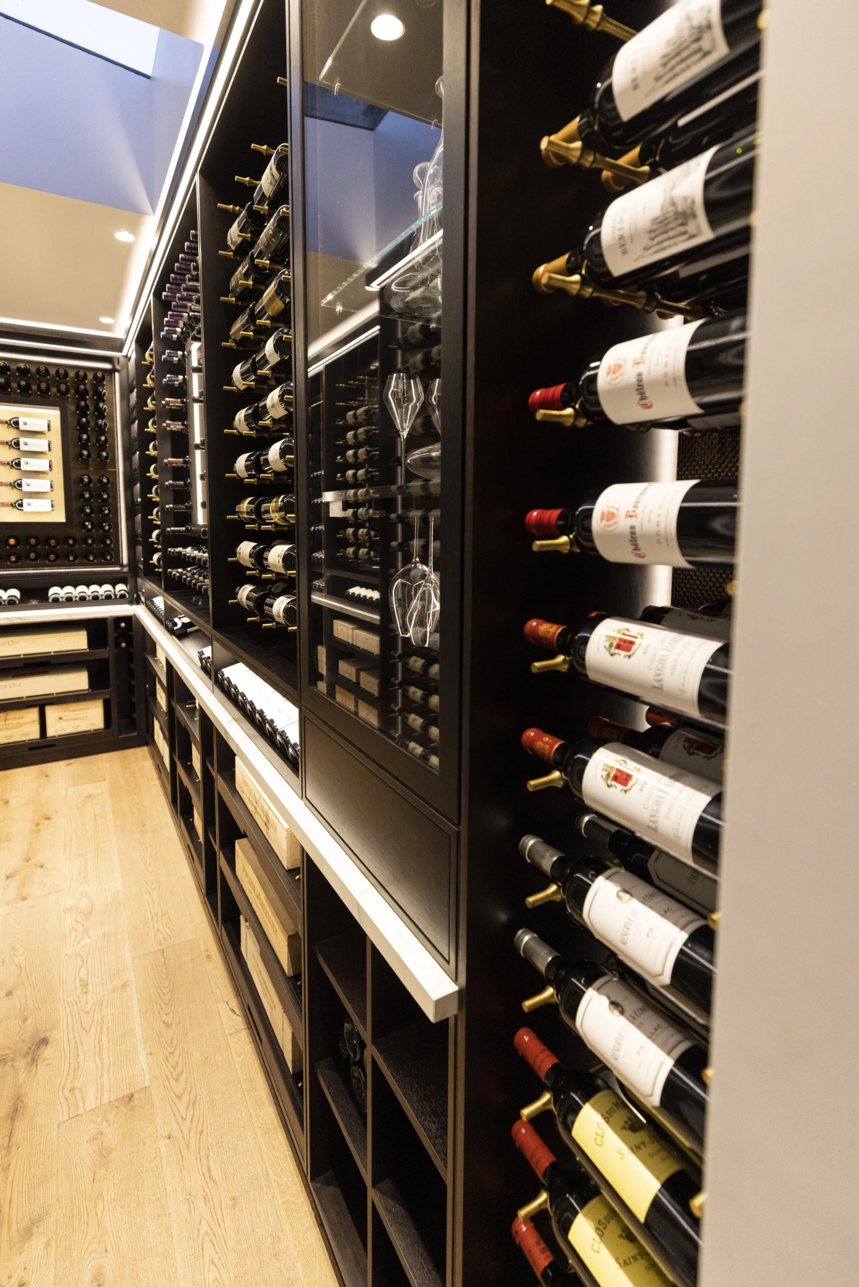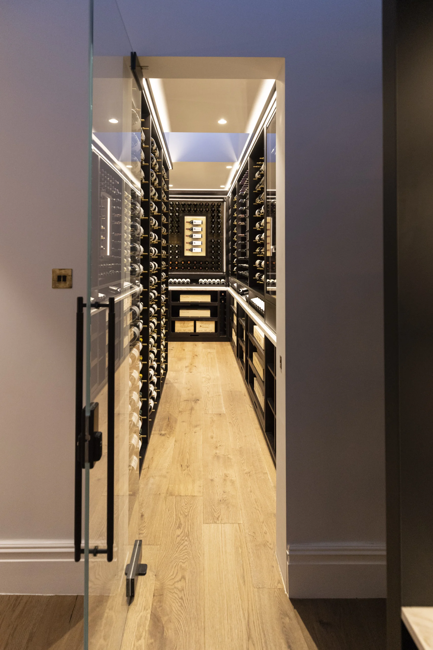 The room has a capacity of 850 bottles of wine, and includes a small storage area for wine glasses and decanters.
