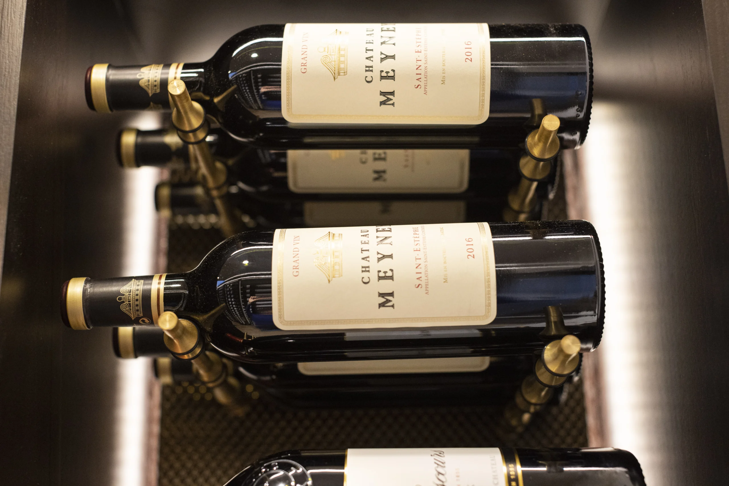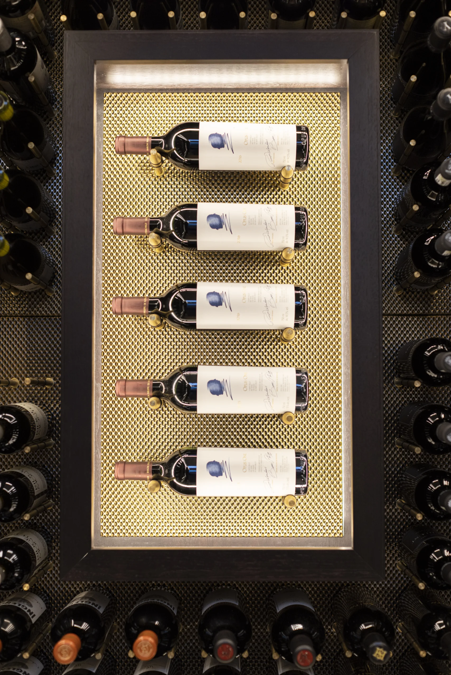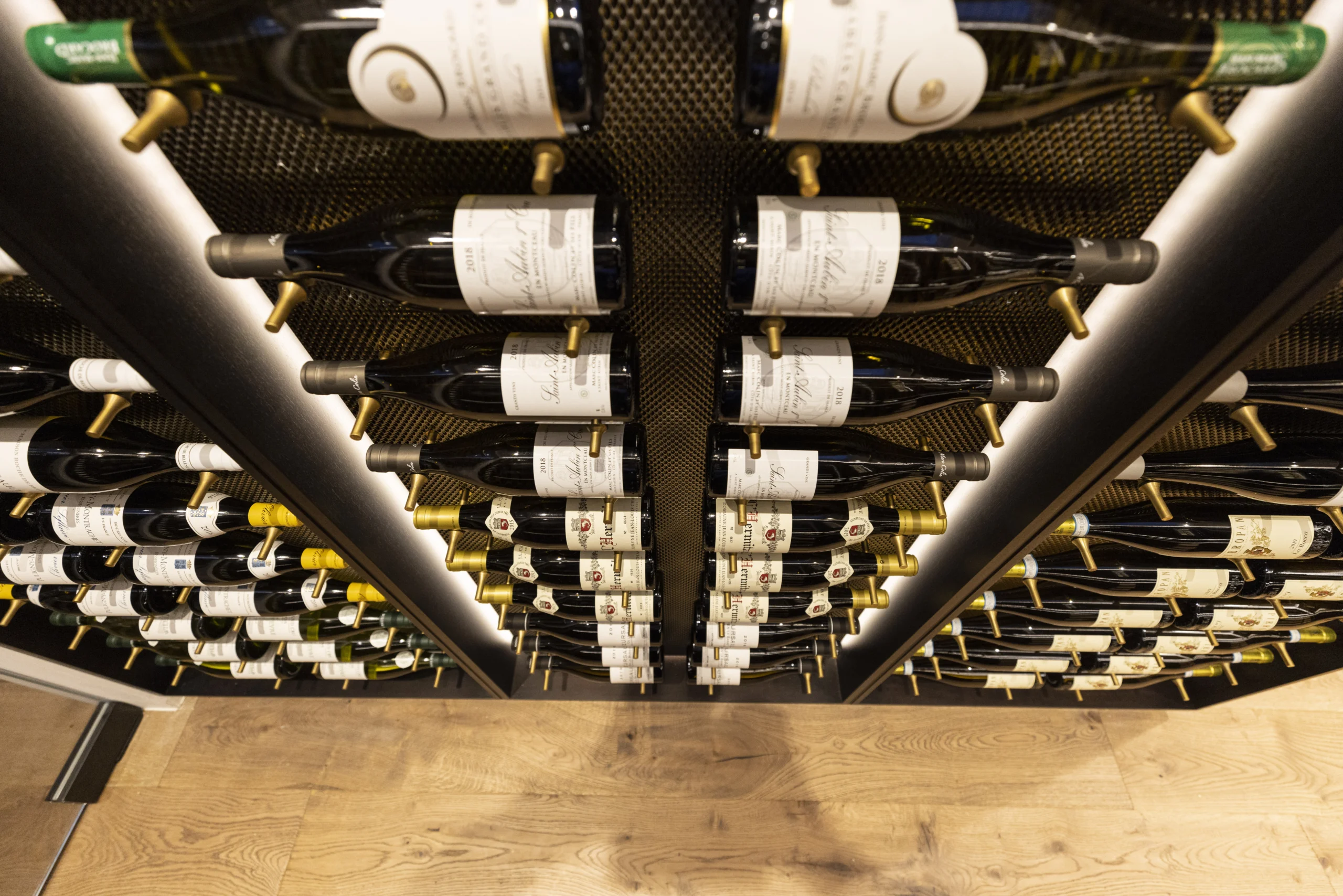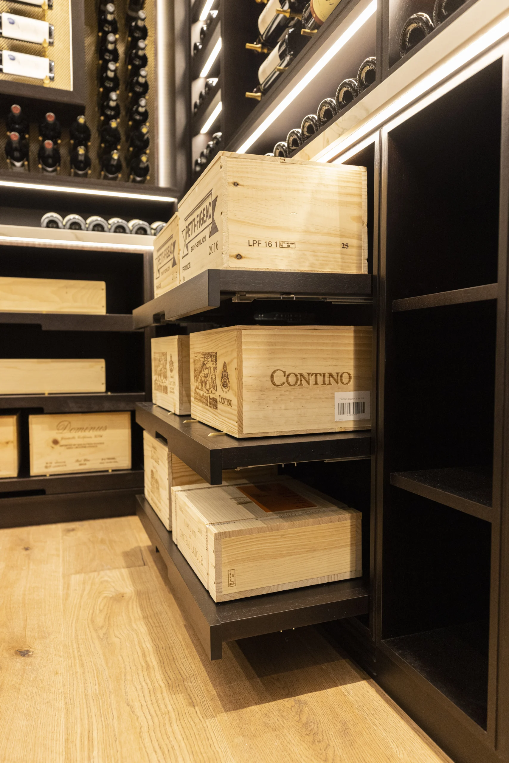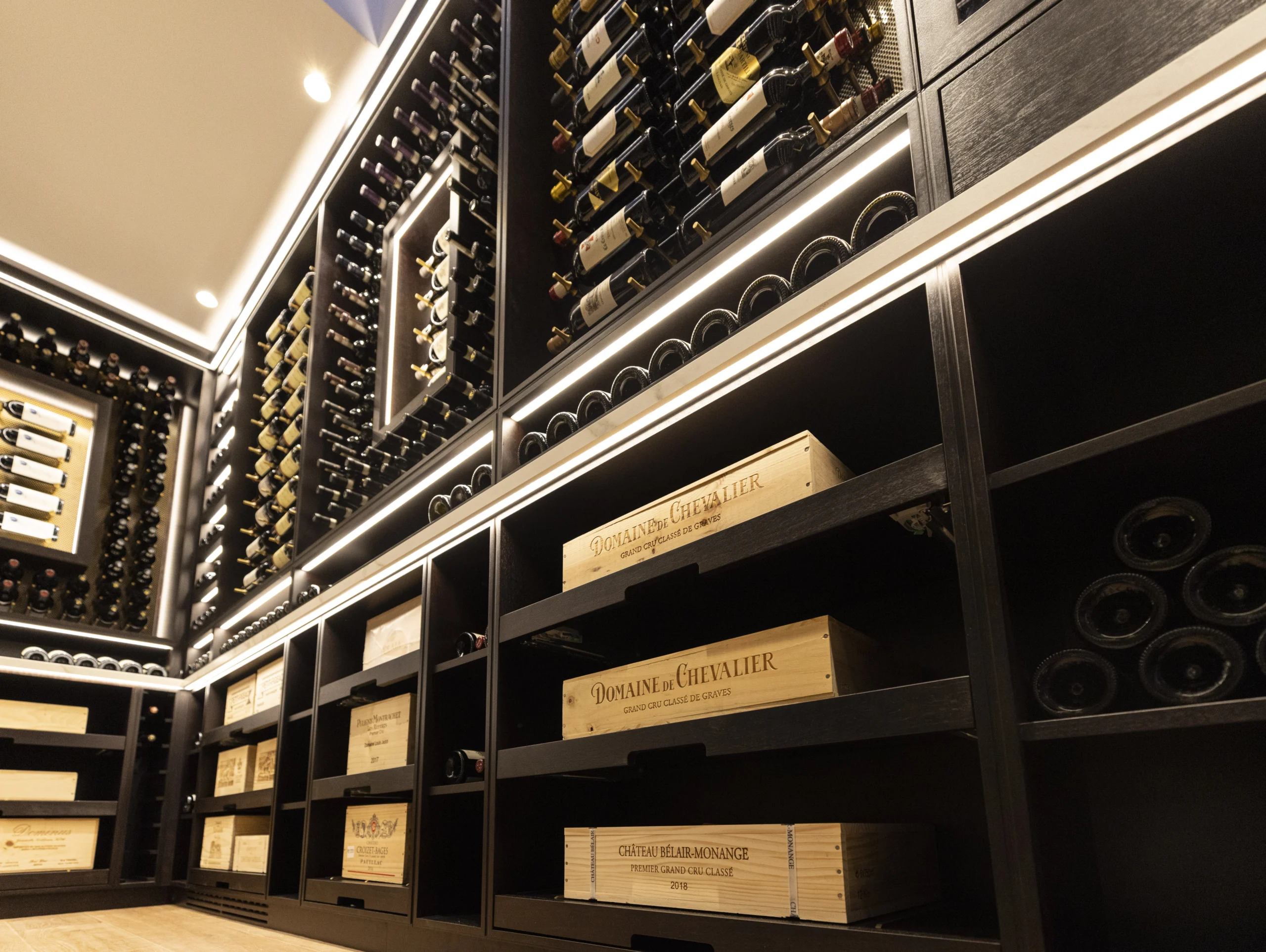 The room has a capacity of 850 bottles of wine, and includes a small storage area for wine glasses and decanters.