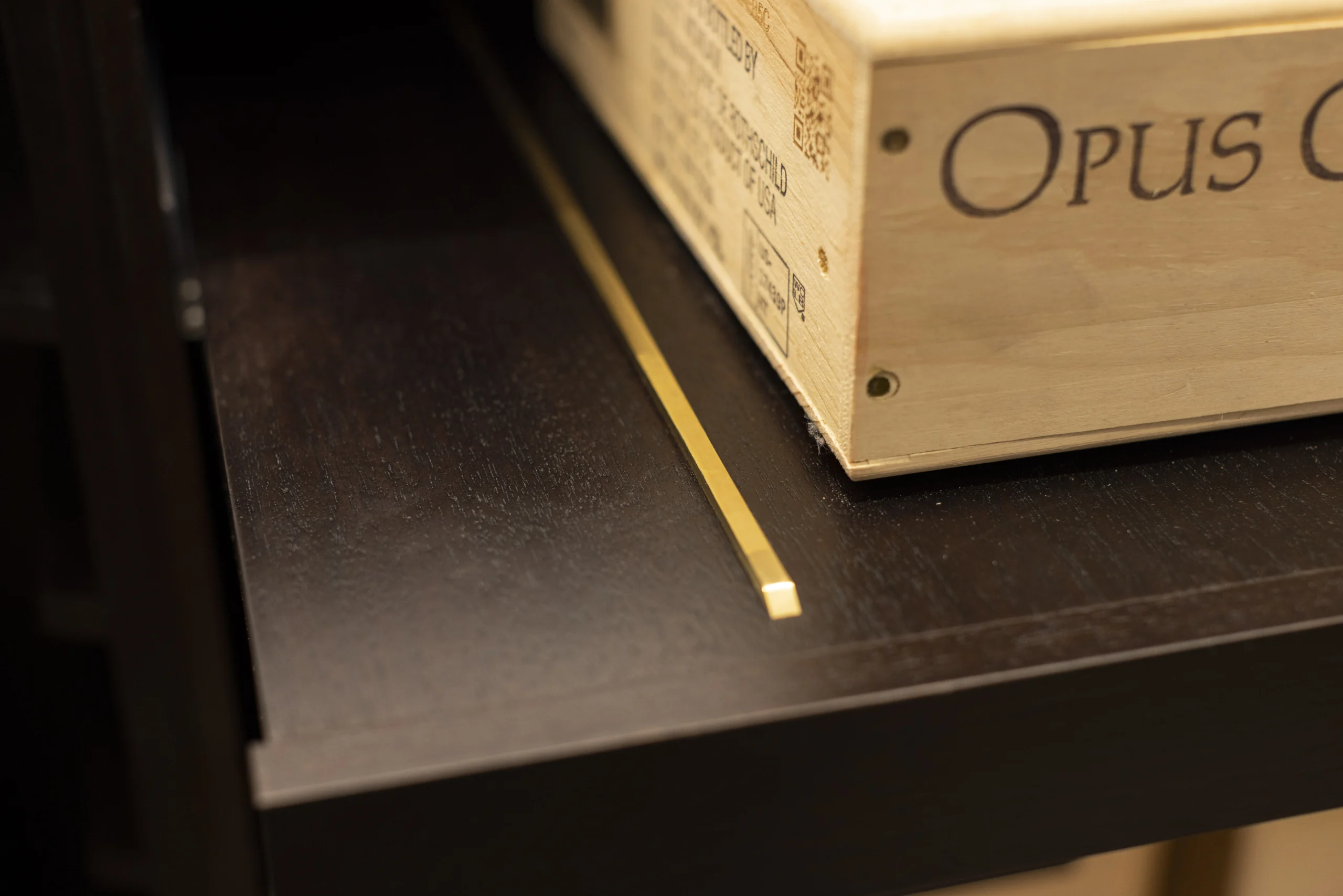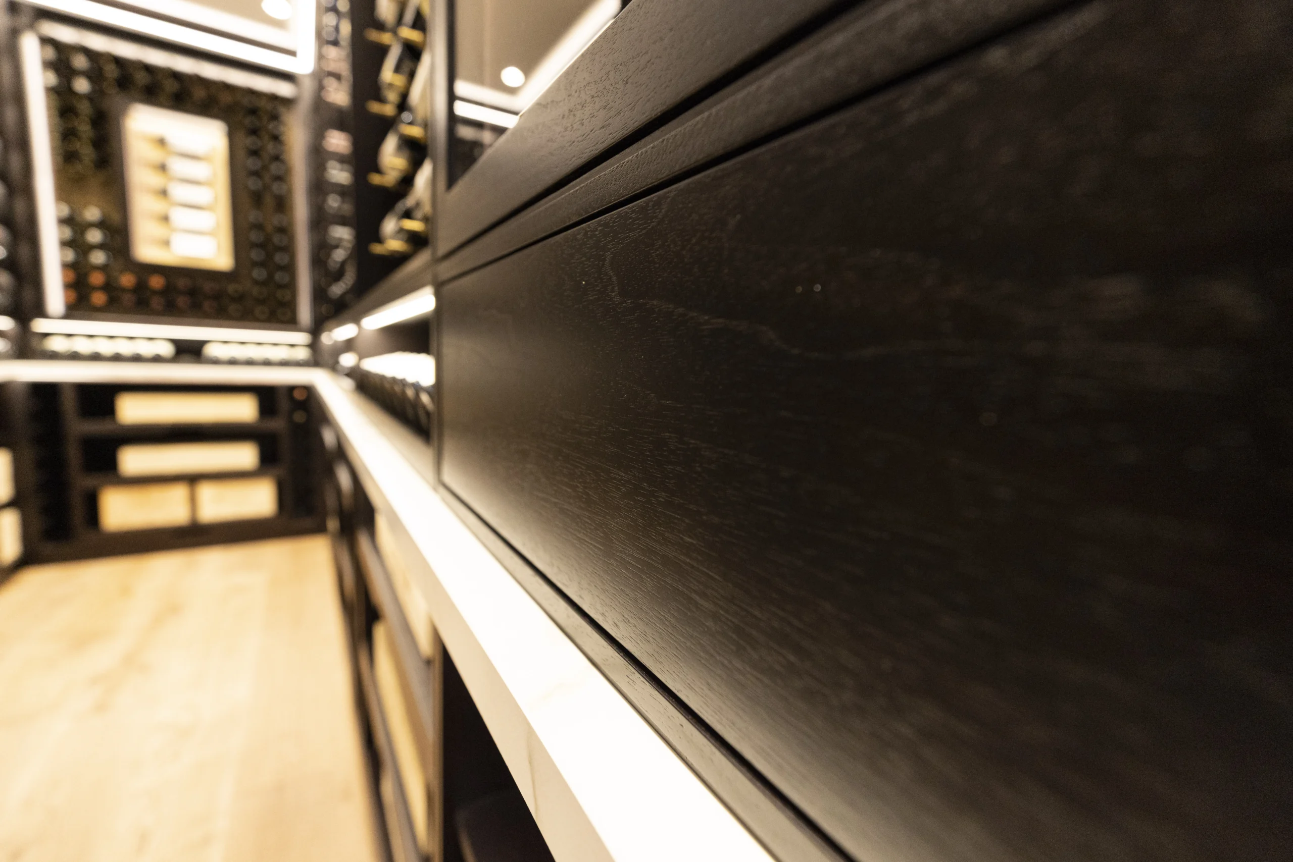 The climate control system is fully integrated, making the room very functional. The wine room is made of American walnut veneer stained to ebony colour, giving the room a dark, elegant look. Brass elements and stainless steel decorative panels add a beautiful touch. Heavy duty soft close drawers can hold up to 60kg of wine cases. And more than 100 metres of LED lights were used to Illuminate the space.